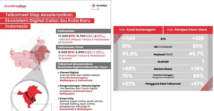 Telkomsel telah memiliki lebih dari 1.140 Base Transceiver Station (BTS) dan 67 persen di antaranya adalah BTS yang menghadirkan jaringan 3G/4G di Kutai Kartanegara dan 220 BTS di Penajaman Paser Utara. Di Panajaman Paser Utara 68 persen dari BTS yang ada sudah menghadirkan jaringan 3G dan 4G.