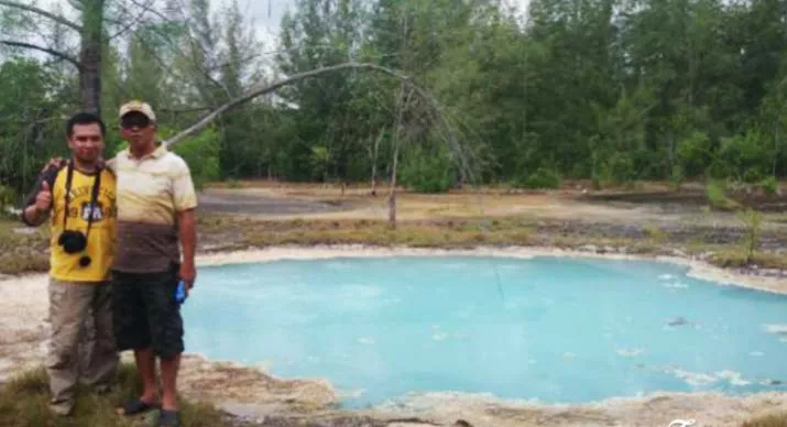 PENINJAUAN WALES– Kepala Dinas Pariwisata Konut Yade Riyanto melakukan foto bersama awak media Zonasultra.com saat melakukan peninjauan pengembangan wisata air panas Wawolesea (Walses) di salah satu titik mata air panas yang berada diantara perkebunan warga di Desa Wawolesesa yang selanjutnya akan dikembangkan menjadi wisata air panas wales, Kamis (27/7/2017).(Jefri/ZONASULTRA.COM)