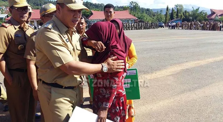 Terharunya Dua Janda Ini Terima Santunan Asuransi Nelayan ASURANSI NELAYAN – Sakka (45) warga Desa Kampoh Bunga wanita janda yang di tinggal mati suaminya yang bekerja sebagai nelayan menerima santunan bantuan dana nelayan yang di berikan Bupati Konut, Ruksamin, Senin (2/10/2017). (Jefri Ipnu/ZONASULTRA.COM)