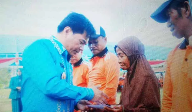 PENYERAHAN BANTUANTerlihat Wakil Bupati konawe utara, Raup SAg, menyerahkan bantuan bedah rumah secara simbolis sebanyak 13 kepala keluarga, dan alat pertukangan serta pertanian, kapada puluhan maayarakat kabupaten konut, dalam acara hari gotong royong masyarakat (HGRM) ke 13 dan hari kesatuan gerak PKK (HKG PKK) ke 44, yang bertempat di desa basule kecamatan lasolo, kabupaten konut. (Foto: Jefri/ZONASULTRA.COM).