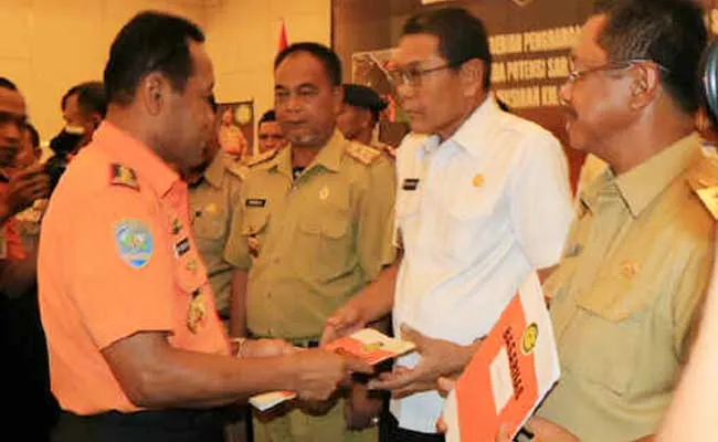 Bupati Kolaka, Ahmad Safei mendapatkan penghargaan dan plakat dari Kepala Badan Search And Rescue Nasional, F. Henry Bambang Soelistyo, Kamis (4/2/2016) di Aula Phinisi Ball Room, Grand Calrion Kendari, Sulawesi Tenggara (Sultra). (Ilham/ZONASULTRA.COM)
