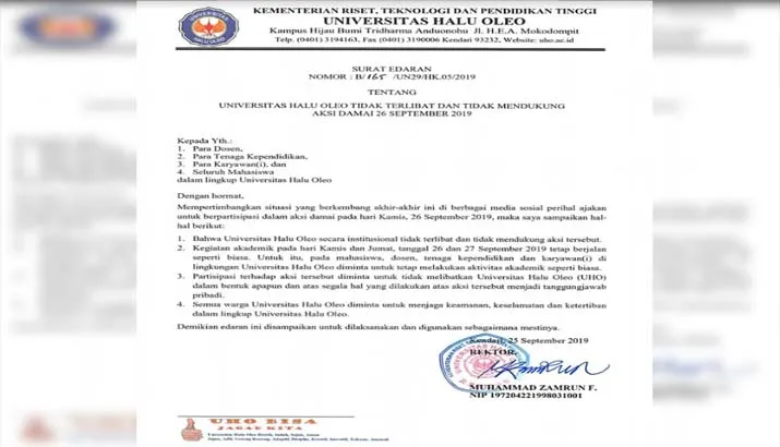 Surat Edaran itu bernomor B/165/UN29/HK.05/2019 yang ditandatangani langsung rektor UHO, Muhammad Zamrun. Isinya menyatakan bahwa UHO tidak terlibat dan tidak mendukung aksi damai pada tanggal 26 September itu.