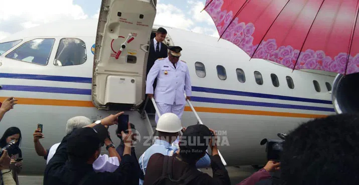 ZONASULTRA.COM, KENDARI – Gubernur Sulawesi Tenggara (Sultra) Ali Mazi akhirnya tiba di Bumi Anoa, Selasa (11/9/2018). Menempuh perjalanan dari Kupang, Nusa Tenggara Timur (NTT) selama dua jam, gubernur yang dilantik 5 September 2018 itu tiba di Bandara Lanud Haluoleo, sekira pukul 13.10 Wita.