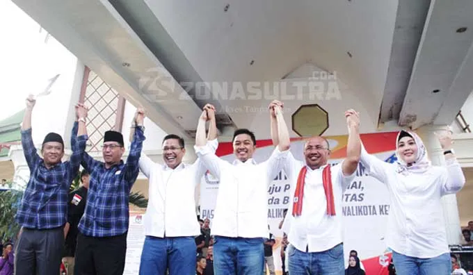 ZONASULTRA.COM, KENDARI – Tiga pasangan calon (paslon) walikota Kendari resmi mendeklarasikan kampanye damai di Pelataran Eks MTQ Kendari, Jumat (28/10/2016). Acara yang dihadiri ratusan pendukung masing-masing paslon tersebut difasilitasi oleh KPU Kendari.