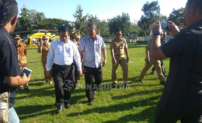 MENTERI PERTANIAN – menteri pertanian amran sulaiman saat tiba di polsek tinaggea. Dalam kunjunganya itu mentan terpaksa harus molor berjam-jam akibat kendala teknis dalam proses pendaratan helicopter yang digunakan mentan. (Erik Ari Prabowo/ZONASULTRA.COM)