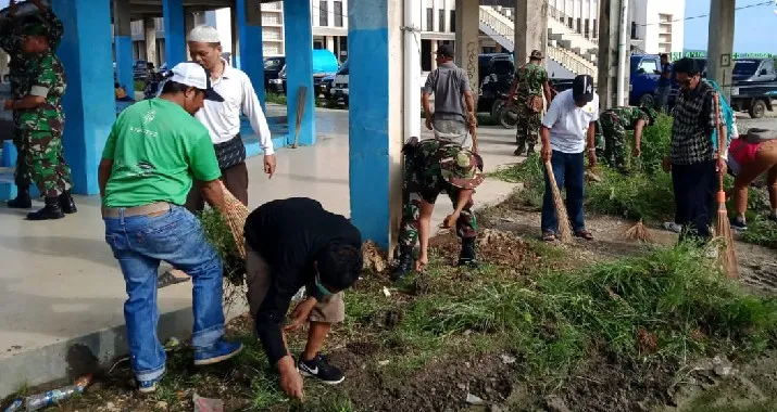 ZONASULTRA.COM, BAUBAU – Prajurit TNI bersama warga binaan Lembaga Permasyarakatan (Lapas) Kota Baubau, Sulawesi Tenggara (Sultra) mengelar kerja bakti dengan membersihkan pasar Wameo, Kamis (12/3/2020). Kegiatan ini telah menjadi rutinitas Kodim 1413 Buton, dan sekitar 20 anggota TNI dari Koramil 1413-01 Wolio diturunkan di lokasi kerja bakti itu.