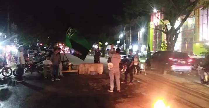 ZONASULTRA.COM, KENDARI – Puluhan orang dari Himpunan Mahasiswa Islam (HMI) Cabang Kendari memblokade ruas jalan di Jalan Saranani depan gedung Hollywood Cinema, Kelurahan Mandonga, Kecamatan Mandonga. Kota Kendari, Kamis (18/7/2019) sekitar pukul 20.00 wita.