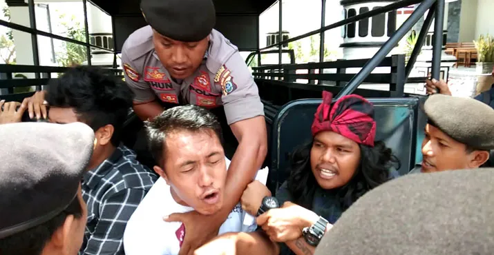 Aksi tersebut seketika langsung dibubarkan oleh kepolisian karena diduga massa berdemo tidak mengantongi surat pemberitahuan. Bahkan sejumlah massa diamankan menggunakan mobil polisi setelah sebelumnya sempat terjadi aksi saling dorong.