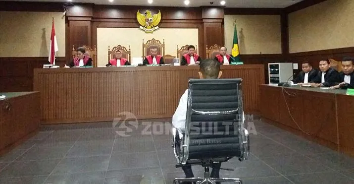SIDANG VONIS – Majelis hakim memvonis Umar Samiun dengab pidana penjara selama 3 tahun 9 bulan dan pidana denda sebesar Rp 150 juta rupiah subsider kurungan 3 bulan di Pengadilan Tipikor, Jakarta Pusat, Rabu (27/9/2017). (Rizki Arifiani/ZONASULTRA.COM)