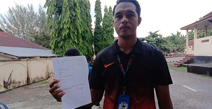 SURAT PENGADUAN - Akhirman menunjukkan bukti surat pengaduan kepada Polres Baubau, Selasa (25/2/2020). Dia mengadukan kelakuan staf sekretariat DPRD karena menghalangi dan mengusirnya saat liputan. (Risno Mandili/ZONASULTRA.COM)
