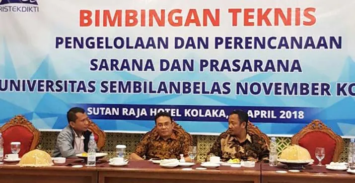 ZONASULTRA.COM, KOLAKA – Universitas Sembilanbelas November (USN) Kolaka, Sulawesi Tenggara (Sultra) menggelar Bimbingan Teknis (Bimtek) Pengelolaan dan Perencanaan Sarana dan Prasarana bagi staf dan pejabat terkait di jajarannya dengan menghadirkan Direktur Sarana Prasarana Kementrian Riset dan Teknologi Pendidikan Tinggi (Kemenristek Dikti) di hotel Sutan Raja Kolaka, Kamis (12/4/2018).