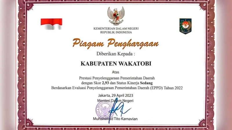 Berkat predikat itu, Pemkab Wakatobi berhak menerima piagam penghargaan yang dicap dengan logo garuda dan ditandatangani oleh Menteri Dalam Negeri (Mendagri) Muhammad Tito Karnavian.