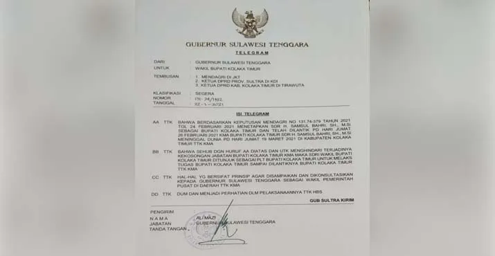 Telegram yang dikirim oleh Gubernur Ali Mazi kepada wakil bupati Koltim tersebut bernomor 131-74/1192 tanggal 22 Maret 2021, tembusan Menteri Dalam Negri (Mendagri), ketua DPRD Provinsi Sultra, dan ketua DPRD Kabupaten Koltim. Sebagaimana yang tertulis dalam isi telegram pada huruf BB menyatakan bahwa untuk menghindari kekosongan jabatan Bupati Koltim, maka saudari wakil Bupati Koltim ditunjuk sebagai Plt Bupati Koltim untuk menjalankan tugas Bupati Koltim sampai dilantiknya Bupati Koltim.