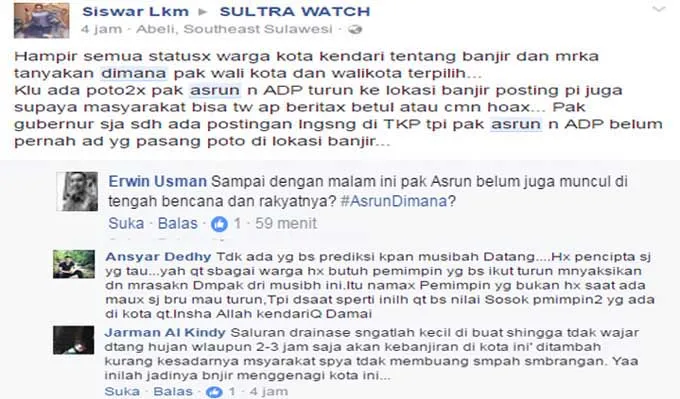 Hal serupa juga diungkapkan oleh akun Siswar Lkm. “Hampir semua statusx warga kota kendari tentang banjir dan merka tanyakan dimana pak wali kota dan walikota terpilih… Klu ada poto2x pak asrun n ADP turun ke lokasi banjir posting pi juga supaya masyarakat bisa tw apa beritax betul atau cmn hoax,” ungkapnya melalui postingannya di Grup Facebook Sultra Watch, Minggu (14/5/2017).