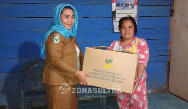 BANTUAN–Terlihat kepala desa andeo kecamatan lasolo kabupaten konawe utara (Konut) Heti Rasnawiah, memberikan bantuan kepada sejumlah warga melalui Kemetrian sosial RI, dan pemda konut pasca tertimpa musibah banjir beberapa waktu lalu. (Jefri/ZONASULTRA.COM).