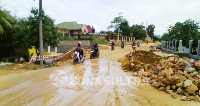 JALAN RUSAK – Kondisi Jalan Dr Soetomo di Kelurahan Tobuha yang banyak dikeluhkan oleh masyarakat setempat, dan sering terjadi kecelakaan karena diakibatkan banyak tumpukan material sepanjang jalan, licin dan berlumpur serta digenangi air pada musim hujan dan berdebu pada musim kemarau. (RAMADHAN HAFID/ZONASULTRA.COM)