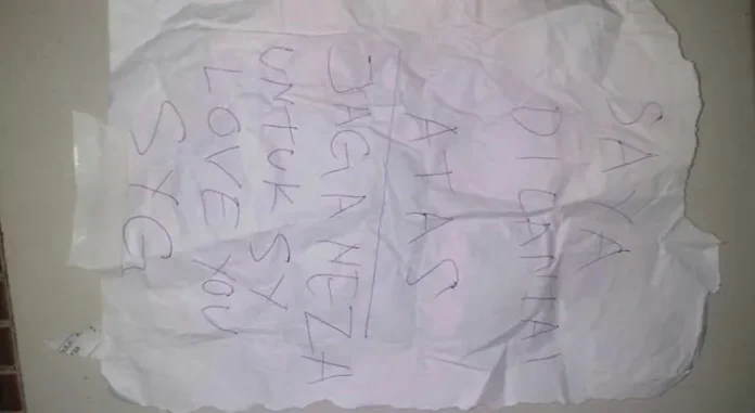 Sebelum nekat mengakhiri hidupnya dengan cara menggantung diri, korban menuliskan pesan pada selembar kertas dan ditempel pada pintu kamar korban yang mengatakan “Saya dilantai atas jaga Neza untuk saya, Love you Syg” tulis korban.