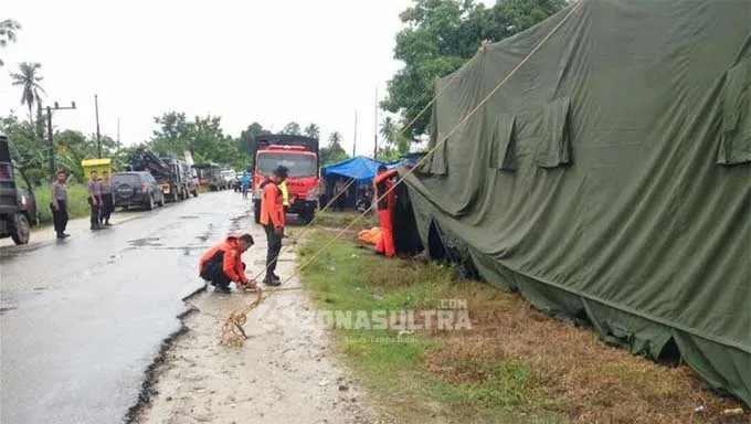 TENDA PLETON – Tim rescue saat mendirikan tenda pleton pengungsian sebanyak dua buah di daerah Sungai Wanggu. (Randi Ardiansyah/ZONASULTRA.COM)
