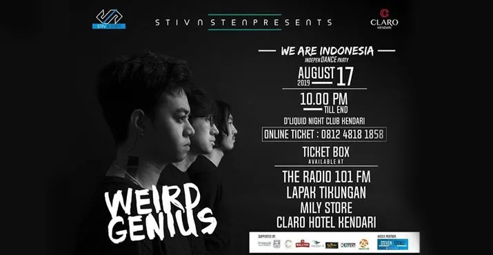 ZONASULTRA.COM, KENDARI – Salah satu grup musik elektronik atau sering dikenal sebutan Elektronic Music Dance (EDM) ternama Indonesia, Weird Genius siap menghibur warga Kota Kendari, tepat di 17 Agustus mendatang melalui IndepenDANCE Party.
