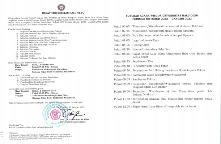 Hari ini, sejumlah 1.323 mahasiswa diwisuda, tapi ada larangan pendamping masuk ke dalam rungan auditorium yang tertulis pada catatan undangan wisudawan yang dikeluarkan Ketua Senat UHO, Profesor La Niampe pada Kamis (26/1/2023) lalu. Dan hari sebelumnya 1.330 mahasiswa.