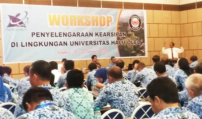 ZONASULTRA.COM, KENDARI – Untuk mewujudkan tata kelola perguruan tinggi yang baik, Unit Pengelola Teknis (UPT) Kearsipan Universitas Halu Oleo (UHO) Kendari, Sulawesi Tenggara (Sultra) menggelar workshop penyelenggaraan kearsipan lingkup UHO di Hotel Plaza Inn Kendari, Senin (18/1/2016).